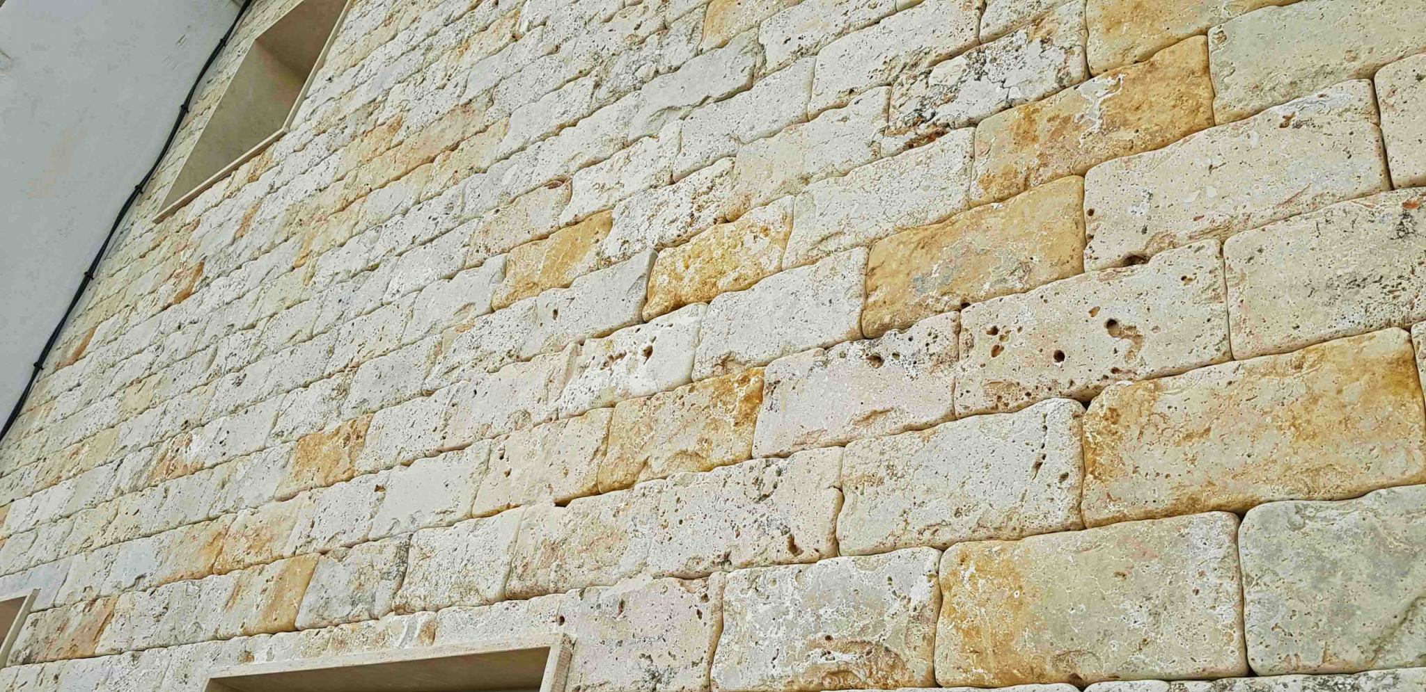 El travertino escarfilado rodado se coloca normalmente para aplacados, tanto para zócalos de travertino de baja altura , como para aplacados de mármol grande.